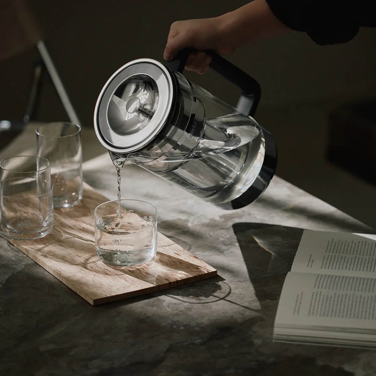 A patented large water filter pitcher with refillable stainless steel cartridge.