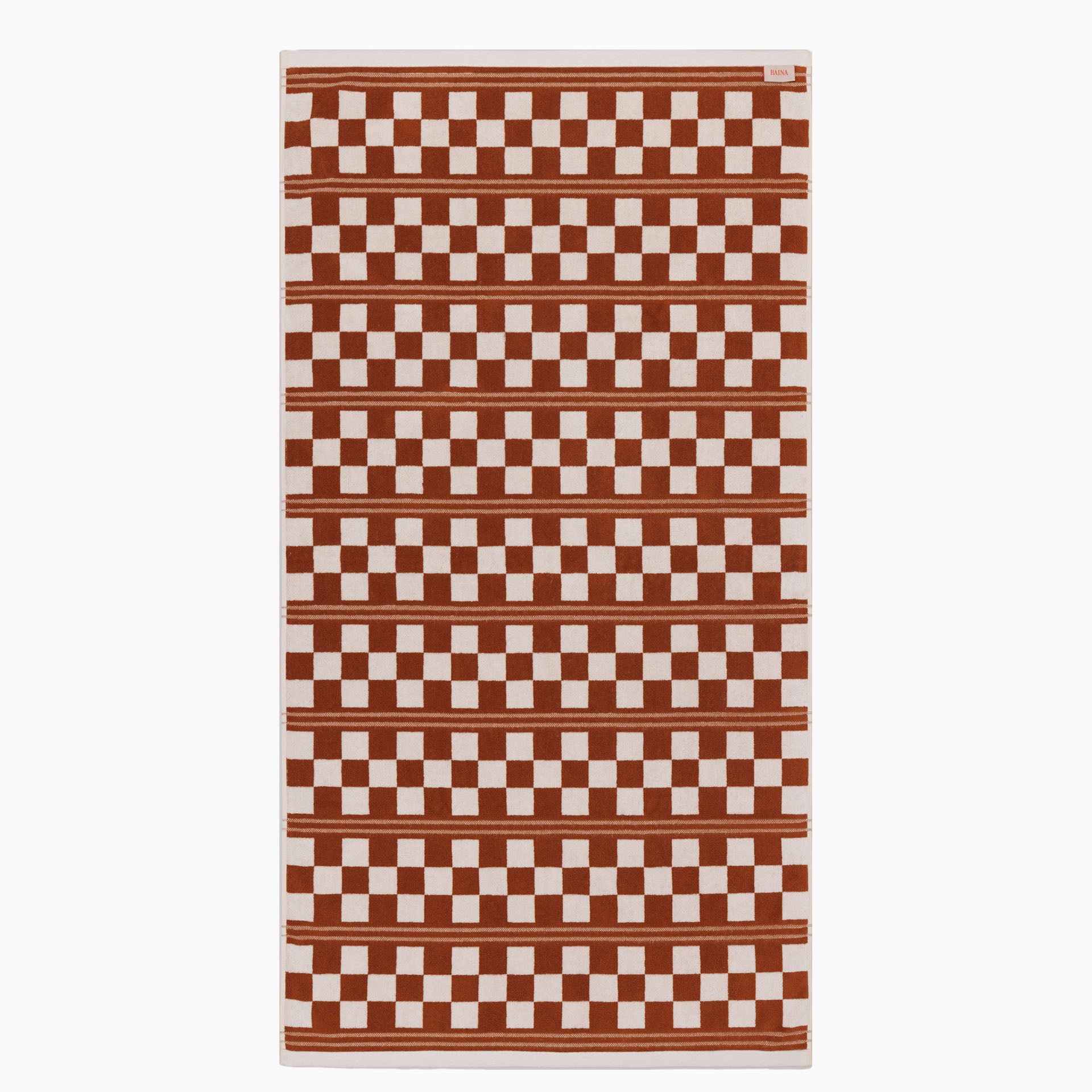 100% Organic Cotton pool or beach towel. A refined take on BAINA’s signature print, the reversible Busby design sees the pairing of bold checkerboard, with a subtle embroidered gridded check.