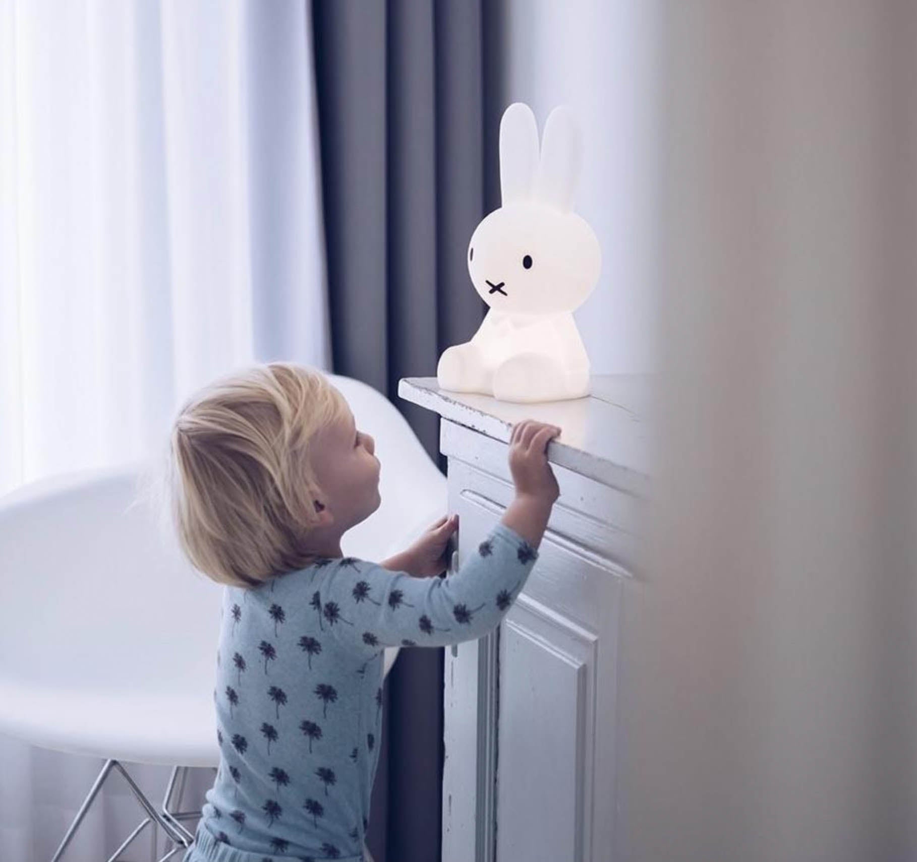 Miffy First Light is the first shining friend of your newest family member. Surprise parents and their little one with the first light in the baby’s life. A unique welcoming present that will serve as a comforting first light a child sees whenever they open their eyes. Sweet and serene, the Miffy lamps work as nightlight for kids and adults alike.