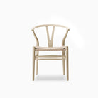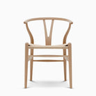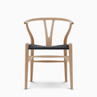 When designing the CH24, Wegner chose to combine the back- and armrest into a single piece. To give stability to the steam-bent top and ensure comfortable support, Wegner developed the characteristic Y-shaped back that the Wishbone Chair is named after. More than 100 steps are required to manufacture each Wishbone Chair, most of which are carried out by hand. The hand-woven seat alone takes a skilled craftsman about an hour to create, using approximately 120 meters of paper cord, the impressive durability and stability of which make the chair both strong and long-lasting.