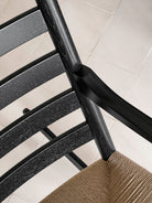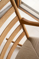 The CH45 Rocking Chair is perfectly proportioned, so one can sit relaxed and rock easily, but can also rise effortlessly from the chair. The reclining backrest adds a dynamic expression to the overall composition, and the kinship with the other furniture in the series is evident in the shaped bars, the envelope-patterned seat of paper cord and the uniquely curved armrests, which are elevated at the rear. These design elements are classically Wegner, as the elevation allows for a solid joint. The grooves at the top of the backrest are also a typical Wegner detail, as they not only appear decorative but can also be used as suspension for a neck pillow.
