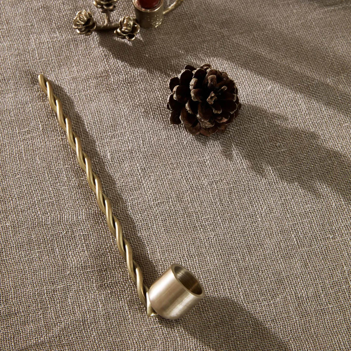 Made entirely from brass, the Candle Snuffer presents an elegant and practical method of extinguishing your beloved candles. With an elongated handle made up of two artfully twisted rods, the Candle Snuffer has a whimsical expression that invites you to make a ritual out of snuffing out your candles at the end of the night. With its decorative expression, you can comfortably leave the Candle Snuffer out on display when not in use.