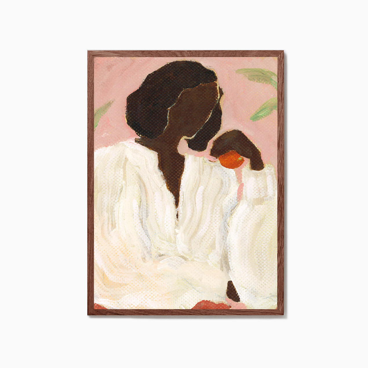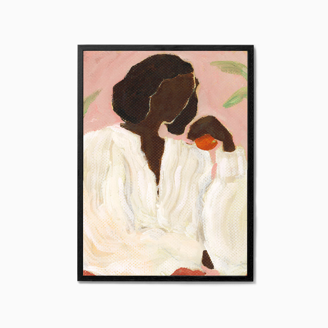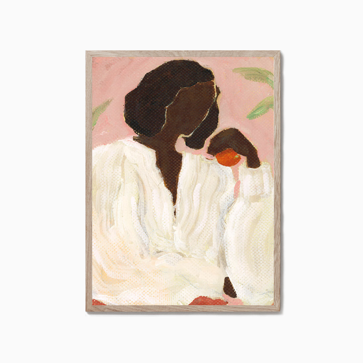 Pink Garden is an art print by the French artistic duo Sacrée Frangine. Featuring a single figure holding an orange, warmth emanates from the work through the use of the rich pink backdrop, greenery and a crisp white shirt. Painted by hand, texture and depth is brought into a composition that transports you to the Mediterranean.
