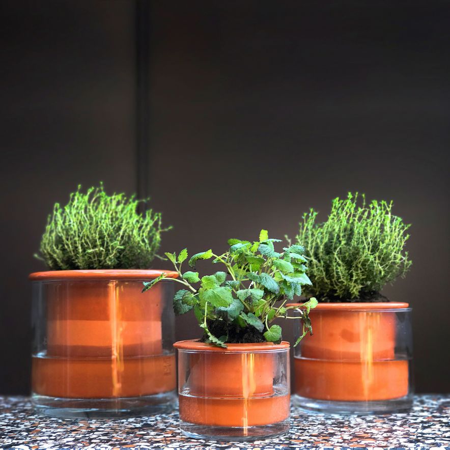 Channel your inner green thumb with these ingenious Swedish pots that won’t let you over- or under-water. Each set consists of a terracotta planter inside a reservoir of hand-blown glass. Just fill the reservoir with water to ensure plants will absorb only what they need through the terracotta pot walls. The upper section of the pot is glazed to make handling easier.