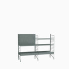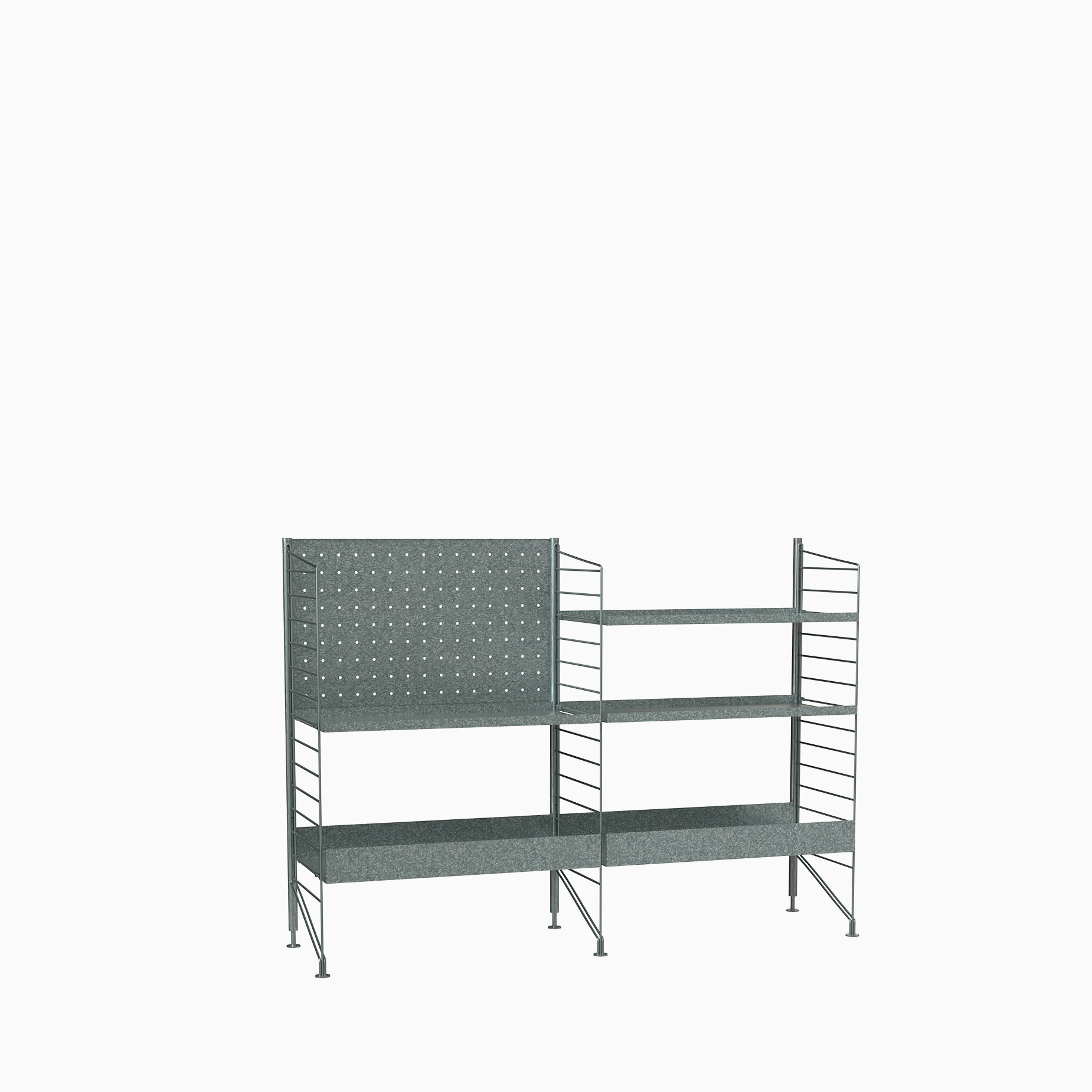 Free standing galvanized shelf intended for outdoor use. This larger three section combination is optimized with shelves on either side of the shelf. A mix of galvanized metal shelves with high and low edge are added to give the combination character. The galvanized material changes over time and leaves you with a beautiful patina.